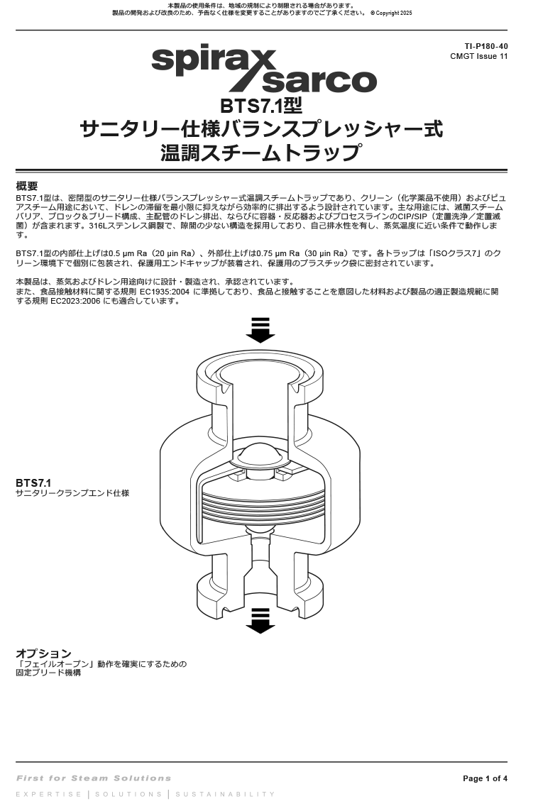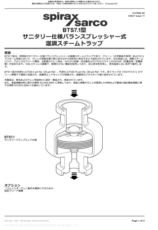 BTS7.1型サニタリー仕様バランスプレッシャー式温調スチームトラップは、凝縮水の滞留を最小限に抑えながら、清浄な蒸気システムから凝縮水を0.7MPagの最大圧力まで除去するように設計されたサーモスタッチック式スチームトラップです。