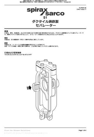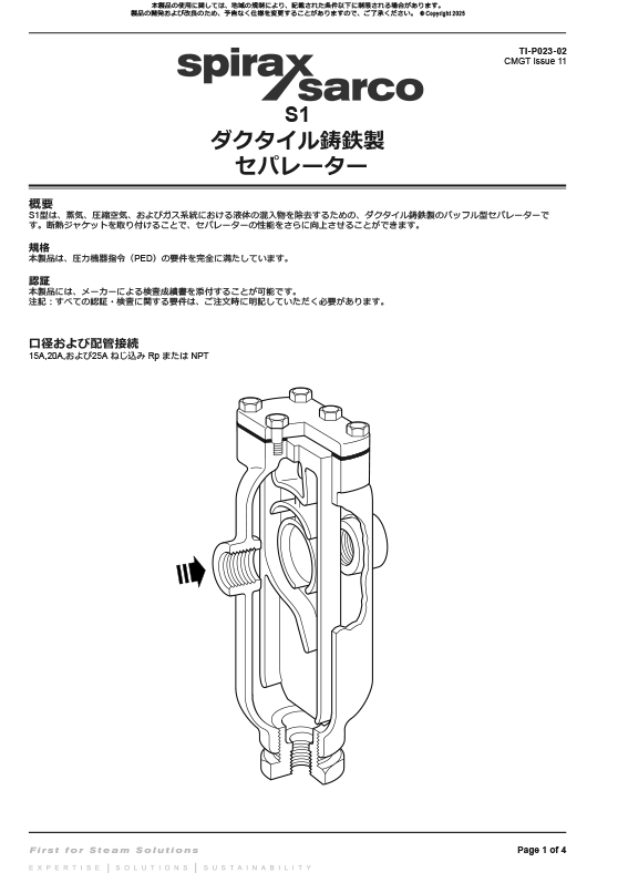 S1型は、蒸気、圧縮空気およびガス系統における液体の混入物を除去するための、ダクタイル鋳鉄製のバッフル型セパレーターです。断熱ジャケットを取り付けることで、セパレータの性能をさらに向上させることができます。